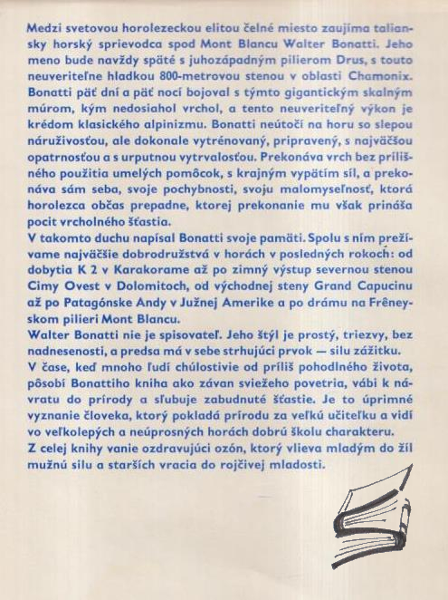 Walter Bonatti (22. června 1930 Bergamo – 13. září 2011 Řím) byl italský horolezec, horský vůdce, cestovatel, novinář a spisovatel, průkopník skalního, kombinovaného, zimního a sólového lezení a skialpinismu. V 18 letech přelezl severní stěnu Grandes Jorasses (4. výstup), prvovýstup východní stěnou na známou skalní jehlu Grand Capucin (1951), 1. zimní výstup Cassinovou cestou na Cimu Ovest (1953), účastník italské expedice na K2, která poprvé dobyla tento vrchol. Sólový prvovýstup na Petit Dru – Bonattiho pilíř (1955), Roku 1958 s Carlo Maurim prvovýstup na Gasherbrum IV (7925m) severovýchodním hřebenem. Šedesátišestidenní skialpinistický přechod Alp od Mt. Caninu (Julské Alpy) po Přímořské Alpy dlouhý 1795 kilometrů. Roku 1965 první zimní sólo výstup na Matterhorn (4478m) severní stěnou. Táto kniha tvorí jeho pamäte.; prvé slovenské vydanie