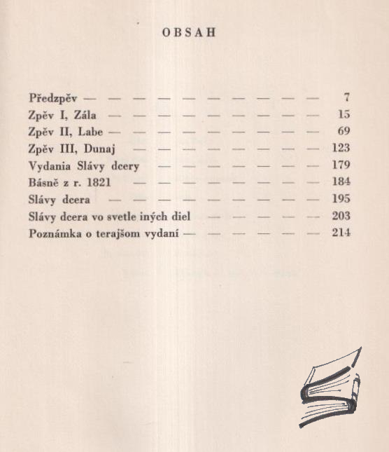 bibliofilské vydanie (celkovo štvrté v Matici) Kollárovho najznámejšieho diela – toto “vydanie, ktoré zahrňuje aj prvé lyrické vydanie Slávy dcery, jadro Básní 1821, opiera sa o text originálneho a vkusného budínskeho “druhého vydání” z 1824. ; ilustráciami doprevádza Martin Benka; nepôvodná pevná preväzba