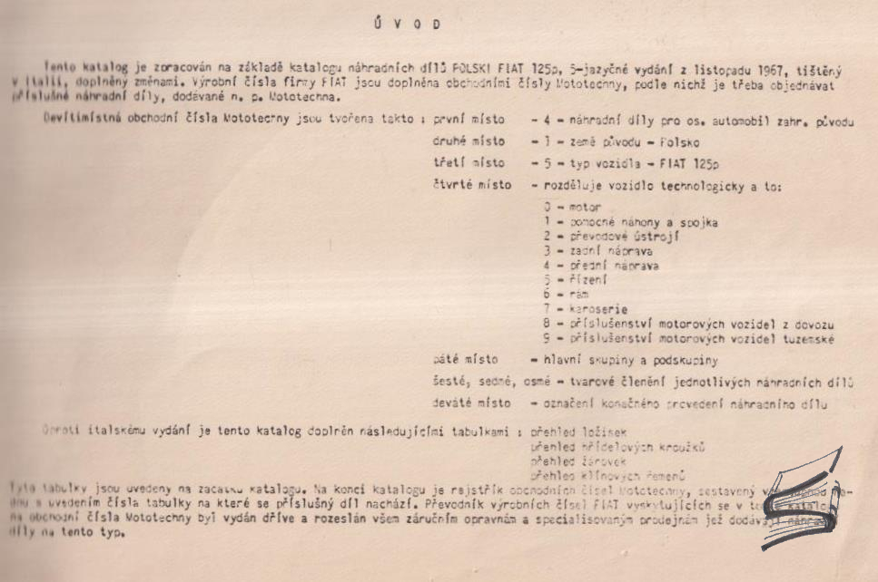 katalóg všetkých náhradných dielov pre automobil Fiat 125p ; 1300 a 1500 spracovaný na základe 5-jazyčného vydania z roku 1967 vytlačeného v Taliansku Fiatom – celostranové zobrazenie schematického rozloženia konkrétnych dielov v ľavej časti dvojstrany, v pravej časti dvostrany popis jednotlivých zobrazených dielov + ich výrobné továrenské označenie; Katalóg vydal Ústav pre výskum motorových vozidiel v licencii poľského štátneho automobilového orgánu POLMO (Zjednoczenie Przemysłu Motoryzacyjnego (Združenie automobilového priemyslu)); obsahuje okrem iného 120 tabuliek na cca 250 stranách; rozmery publikácia cca 20×30 cm (výška x šírka)