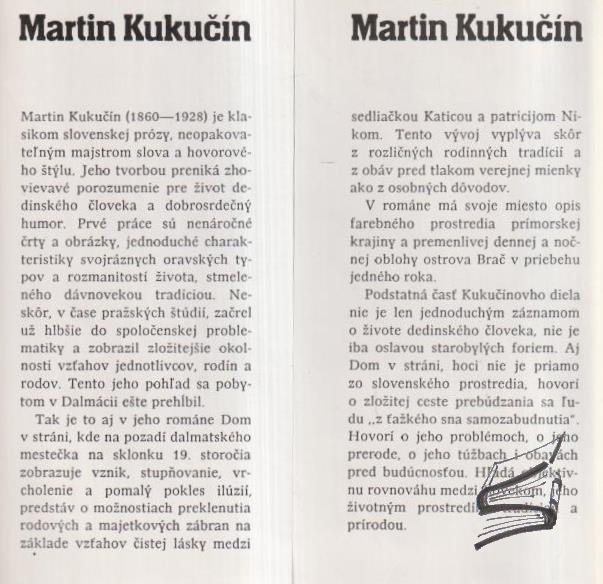 Dej vrcholného diela M. Kukučína sa odohráva v malom juhoslovanskom mestečku na ostove Brač v Dalmácii, kde spisovateľ pôsobil v r. 1894 – 1906 ako lekár.. Je to príbeh lásky sedliačky Katice a bohatého statkárskeho syna Nika, ktorých nerovný vzťah nevydrží ťažké skúšky. Proti ich láske sa stavia nielen verejná mienka, ale aj Nikova matka, šora Anzula a Katicin otec Mate Berac. Jeho smrť je symbolickou predzvesťou konca mladej lásky, ale aj zániku patriarchálneho sedliactva. Hoci dej románu zasadil Kukučín do Dalmácie, srdcom zostal v slovenskej dedine a dodnes sa nám prihovára živou rečou veľkého umenia…doslov Július Noge; štvrté vydanie v ČŠM
