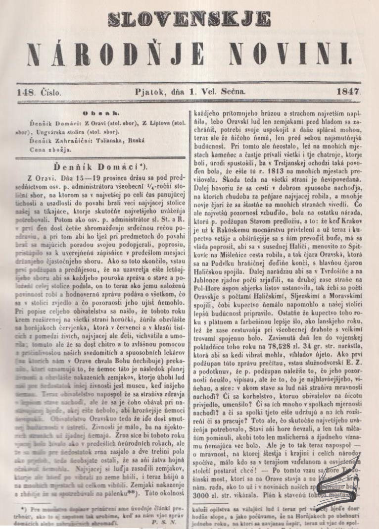 Anotácia Nami ponúkaný exemplár (jedná sa iba o jeden zväzok (!) z viaczväzkového kompletu) obsahuje veľkoformátový reprint sto čísiel štúrových SNN - od čísla 148, ktoré vyšlo 1. januára 1847 až po číslo 248, ktoré vyšlo 31. decembra 1847. Zachytáva teda udalosti roku 1847 (vrátane Uhorského / Krajinského snemu z novembra 1847). Štúrove Slovenské národné noviny vychádzali od 1.8.1845 do 9.6.1848 poväčšine dvakrát do týždňa, od druhého čísla aj so samostatnou prílohou Orol Tatránski (ten vychádzal ako dvojtýždenník). V 50tych rokoch minulého storočia ich pod pôvodným názvom (ako reprint) vydalo SVPL v štyroch zväzkoch - prvé tri zväzky (z nich jeden je nami ponúkaný exemplár) prinášajú samotné Slovenskje národňje noviny, štvrtý zväzok priniesol kompletnú prílohu Orol tatránskí