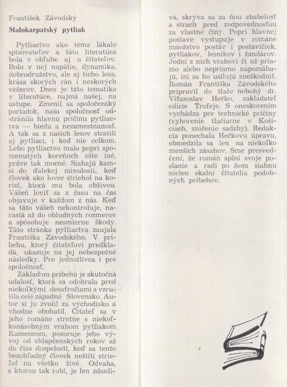 Anotácia k novšiemu vydaniu: Račištorfskí pytliaci prepadajú pytliackej vášni. Ich bezohľadnosť a vzdor vyvoláva potýčky s horármi, ich pušky mieria nielen na zver. Výstrel vodcu pytliakov na nájomcu revíru v lese na Zálistku spúšťa lavínu tragických udalostí… Dramatický príbeh pytliaka, ktorý šokoval obyvateľov hlavného mesta a širokého okolia, sa odohráva v dedinkách a lesných revíroch juhozápadnej časti Malých Karpát. Beletristický obraz udalostí sa opiera o výpovede pamätníkov a dobové dokumenty. Autentické opisy prostredia, prírody a rázovitých postáv čitateľa vťahujú do deja a menia na jeho účastníka.; prvé vydanie