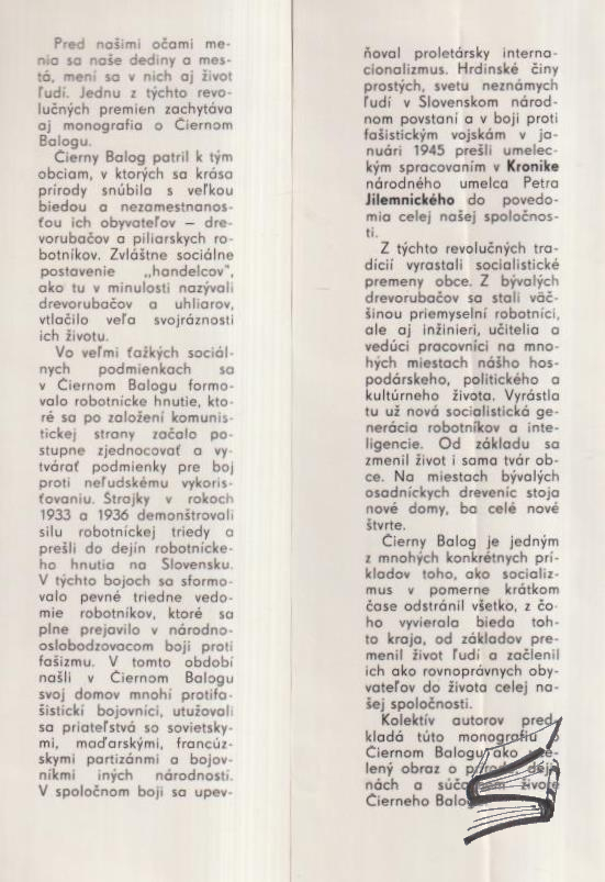 | Anotácia | prvé vydanie monografie o Čiernom Balogu v náklade 3000 kusov - 276 strán + 80 čb príloha + 16 far. príloha; súčasťou exempláru nie je voľne vložená 32-stranová príloha |